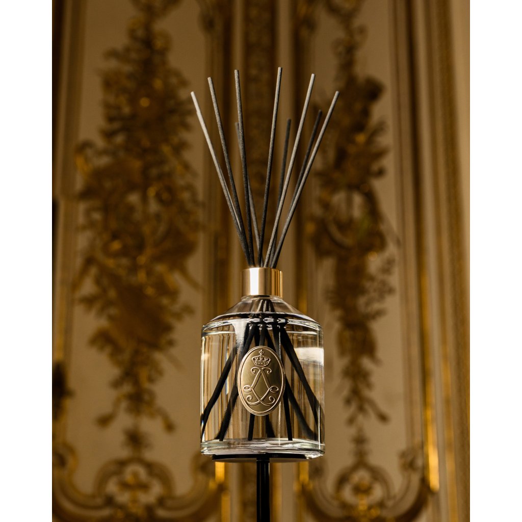 Tyčinkový difuzér s oficiální licencí zámku Château de Versailles vyroben v honosném zámeckém duchu ze silnostěnného skla se zlatou korunkou a královskou pečetí s monogramem LL nejen krásně ozdobí, ale především provoní interiér prvotřídním niche parfémem z dílny renomované francouzské parfumérky Cécile Zarokian. Vše krásně zabaleno v elegantní krabičce se zlatou ražbou, kterou je radost otevřít.