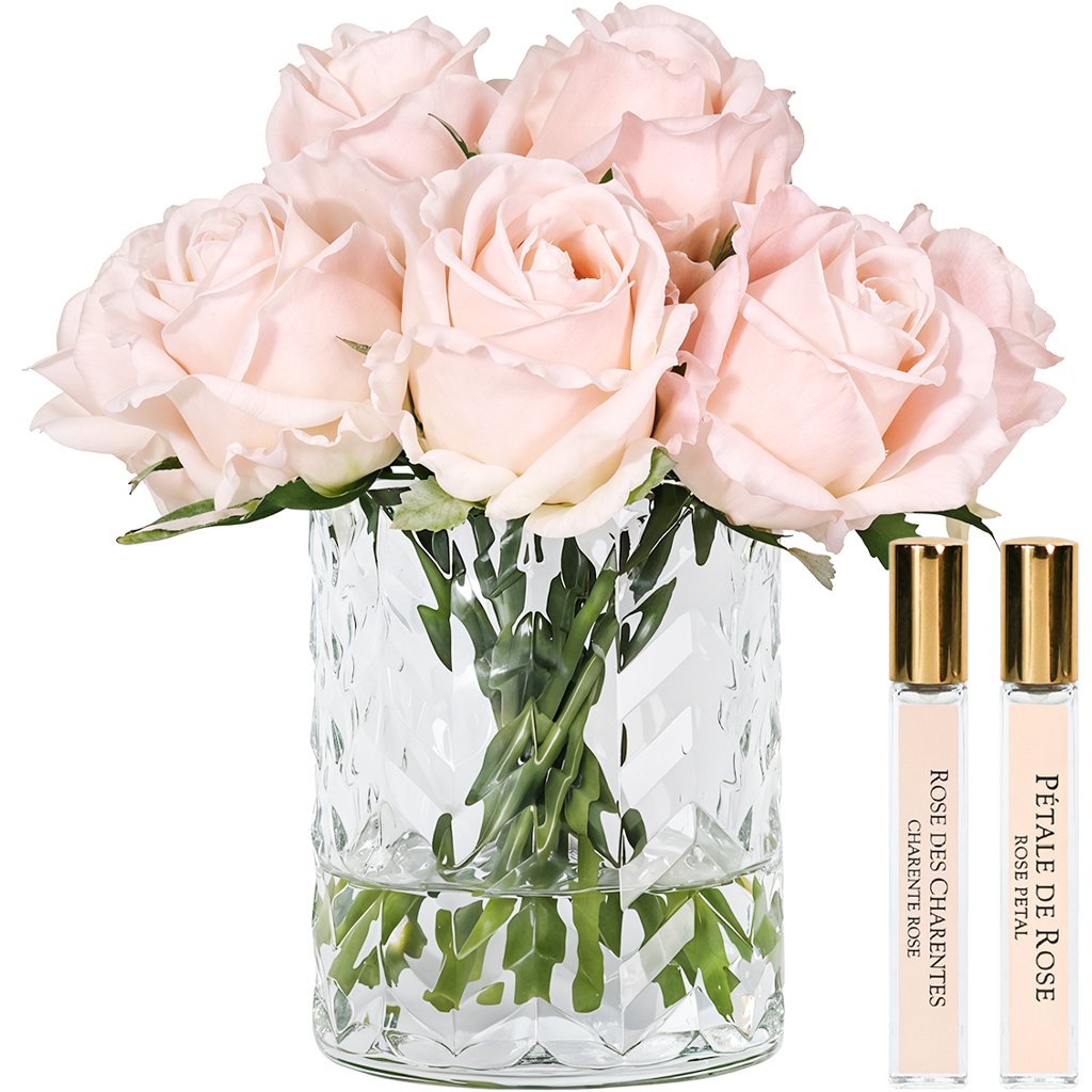Součástí balení jsou dvě 10 ml lahvičky francouzských parfémů, které se aplikují přímo na květy a dodávají kytici nezaměnitelný nádech svěžesti a elegance. Vůně Rose Petal zachycuje okamžik, kdy se mladé okvětní lístky růží zahřívají pod odpoledním sluncem – jemná, svěží a radostná, s nádechem pivoňky, kosatce a hebkého ibišku. Charente Rose naopak přináší klid a hloubku klasické růže v její nejčistší podobě, s dotekem růžových listů a smyslným základem bílého pižma. Spolu vyprávějí příběh o kráse, která nikdy neuvadne.