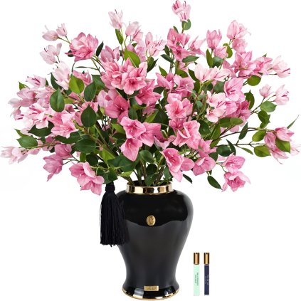 Vneste do svého interiéru nádech nadčasové elegance a živé krásy s touto dechberoucí kyticí bougainvilií. Každý detail byl vytvořen s mistrovskou péčí, od jemných okvětních lístků s hedvábným povrchem až po ručně provoněné květy, které dodají prostoru jemnou, podmanivou vůni. Aranžmá je zasazeno do porcelánové vázy ve stylu Chinoiserie, zdobené zlatým emblémem Côte Noire, symbolem vytříbeného vkusu a elegance.
