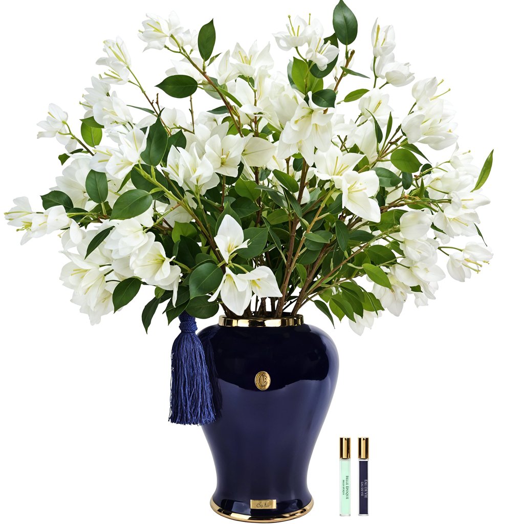 Vneste do svého interiéru nádech nadčasové elegance a živé krásy s touto dechberoucí kyticí bougainvilií. Každý detail byl vytvořen s mistrovskou péčí, od jemných okvětních lístků s hedvábným povrchem až po ručně provoněné květy, které dodají prostoru jemnou, podmanivou vůni. Aranžmá je zasazeno do porcelánové vázy ve stylu Chinoiserie, zdobené zlatým emblémem Côte Noire, symbolem vytříbeného vkusu a elegance.