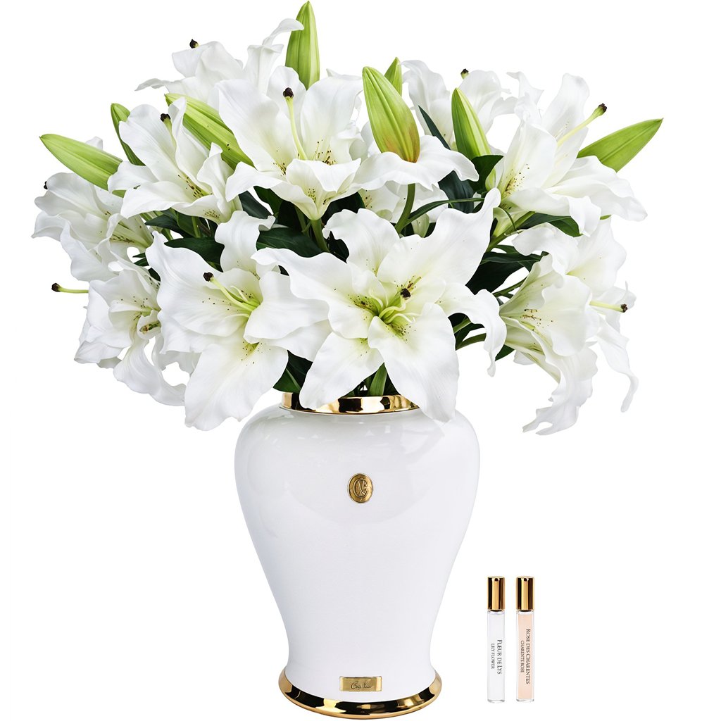 Vneste do svého interiéru nádech nadčasové elegance a živé krásy s touto dechberoucí kyticí lilií. Každý detail byl vytvořen s mistrovskou péčí, od jemných okvětních lístků s hedvábným povrchem až po ručně provoněné květy, které dodají prostoru jemnou, podmanivou vůni. Aranžmá je zasazeno do porcelánové vázy ve stylu Chinoiserie, zdobené zlatým emblémem Côte Noire, symbolem vytříbeného vkusu a elegance.