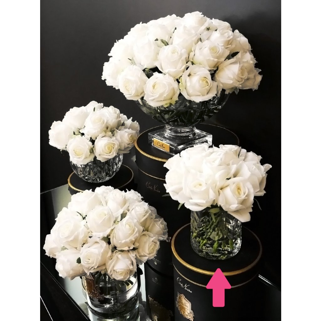 Luxusní parfémovaná kytice 11 růžových poupat elegantně umístěna ve skleněné váze zdobené vzorem Herringbone a prezentovaná v atraktivní boxu se stříbrnou kovovou plaketou a velkou romantickou mašlí. Každá růže je precizně zpracována a opatřena speciálním povlakem, který dodává okvětním lístkům přirozený vzhled. Součástí balení jsou dva prvotřídní francouzské parfémy Rose Petal a Charente Rose, které se aplikují přímo na růže dle preferované intenzity vůně.