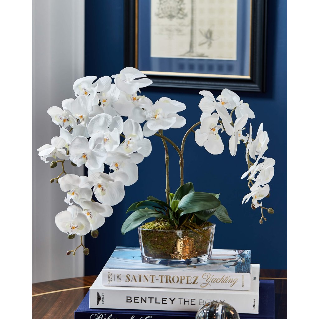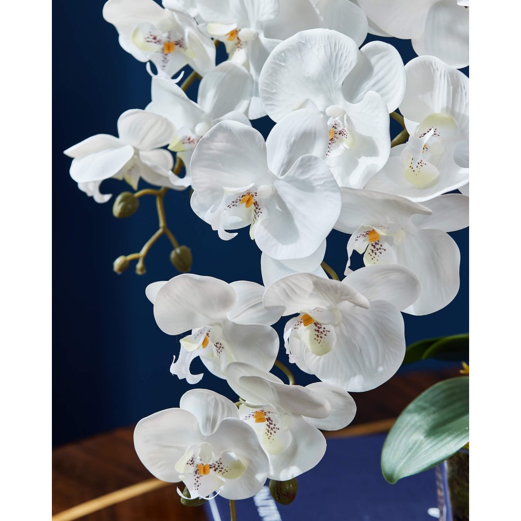 Luxusní parfémovaná kytice bílých orchidejí v elegantní váze se zlatou kovovou plaketou. Každá orchidej je precizně zpracována a opatřena speciálním povlakem, který dodává okvětním lístkům přirozený vzhled. Součástí balení jsou francouzské parfémy Black Orchid a Charente Rose, které se aplikují přímo na orchideje dle preferované intenzity vůně.
