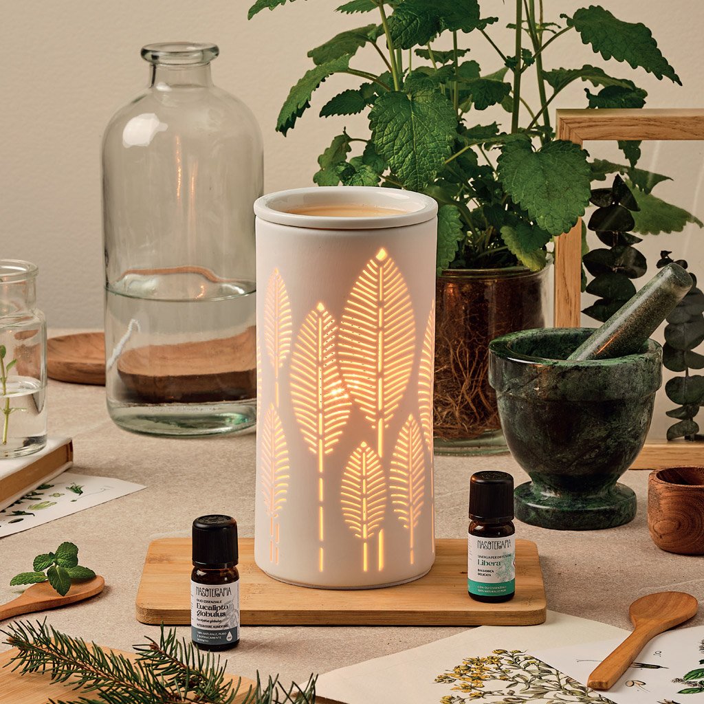 Evaporační difuzér Laurus s motivy vavřínových listů rozptyluje esenciální oleje do prostoru bez přidání vody a pouze působením tepla žárovky. Je bezpečný i v přítomnosti dětí či domácích mazlíčků a ideální do kanceláře nebo míst, kde nechcete používat oheň či hrozí rozlití. Elegantní provedení z keramiky včetně odnímatelné nádoby pro snadné čištění z něj dělá stylový doplněk, který spolu s vůní a tlumeným světlem navodí příjemnou atmosféru.