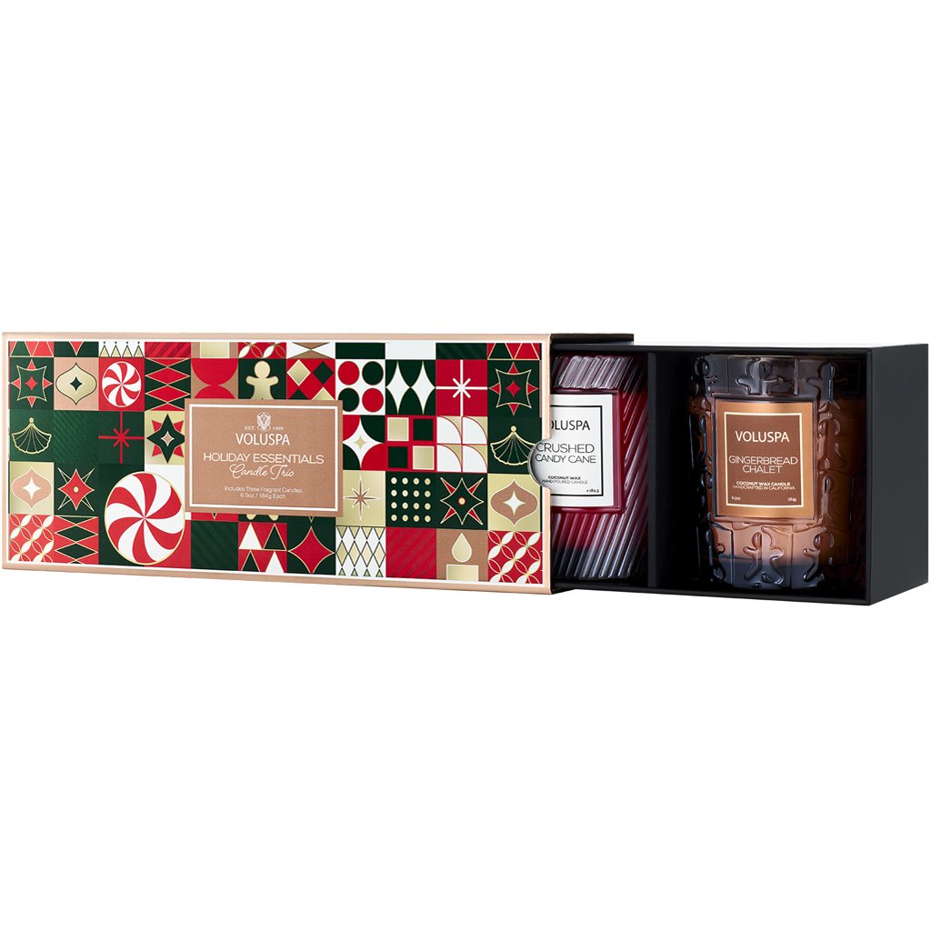 Luxusní dárková sada svíček Voluspa se svátečními vůněmi Noble Fir Garland, Crushed Candy Cane a Gingerbread Chalet. Svíčky vytváří příjemně provoněnou atmosféru a v prostoru se vyjímají jako klenot. Krémově bílý kokosový vosk zachovává bohaté aroma včetně jemných tónů a zajišťuje čisté hoření. Skvělý dárek pro milovníky kvalitních vůní, který potěší nejen obsahem, ale i hravým svátečním designem.