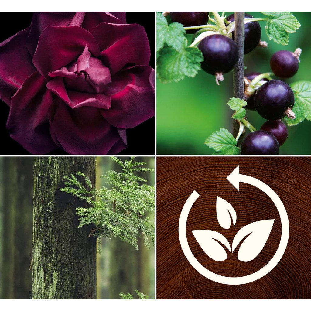 Černý rybíz, sklizený ve Francii a jemná svůdnost klasické vůně růže a esenciálního oleje z cedru, získaného upcyklací cedrového dřeva.